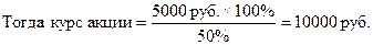 Например, если акционерное общество выплачивает дивиденд 5000 руб. на 1 акцию номиналом 1000 руб., процентная ставка по вкладам в Сбербанке или коммерческом банке 50 % годовых, то рыночная цена акции равна 10000 руб.