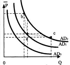Из рисунка 12-1 видно, что рост совокупного спроса может сопровождаться и сокращением реальных совокупных расходов при очень большом росте цен (движение из точки а в точку b), и снижением цен - при очень большом росте объема совокупного спроса (движение из точки а в точку с). Единственное, что не может при этом наблюдаться одновременное сокращение реальных расходов и снижение цен.