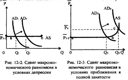 Рост уровня совокупного спроса. Совокупное предложение. Рассмотрим экономику, находящуюся в состоянии глубокой затяжной депрессии, при стабильных ценах и массовой безработице. Если в такой экономике начнётся рост совокупного спроса (например, за счёт государственных заказов), фирмы, ощутив это, будут увеличивать объемы производства, нанимая больше работников, закупая больше сырья и топлива, повышая степень загрузки производственных мощностей и т.д. Будут ли при этом расти цены? Лишь в случае роста средних издержек. Но при неизменной технологии единственной причиной этого мог бы стать рост цен на ресурсы (предположим, что лишь ничтожно малая часть ресурсов закупается за рубежом). Рост производства сопровождается ростом спроса на ресурсы, но это не вызовет их подорожания: слишком велик их избыток, слишком много незанятых ресурсов. Итак, происходит рост производства и продажи национального продукта без заметного повышения уровня цен (рис. 12-2).