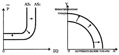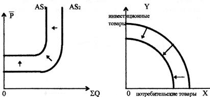 Рост совокупного предложения выглядит как смещение кривой AS вправо и вниз (рис. 12-7). Это равнозначно расширению производственных возможностей национальной экономики и отражается на кривой производственных возможностей как экономический рост.