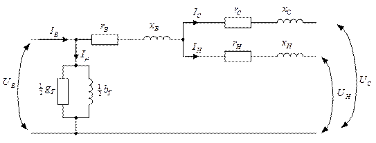 По найденным значениям ΔPк и uк,% по вышеприведенным формулам рассчитываются сопротивления для схемы замещения трехобмоточного трансформатора.