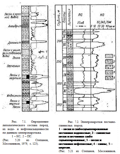 Различия в физических свойствах горных пород (проницаемость, абсорбция, диффузия и др.) делают возможным диагностировать основные типы терригенных, глинистых и карбонатных отложений по кривым ПС и КС (рис. 7.1, 7.2).