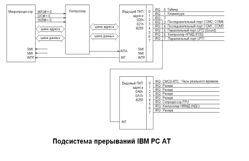 - ведущий ПКП. К нему подключатся линии прерываний IRQ0- IRQ7.Из пространства ввода-вывода для него выделены адреса 20h- 21h