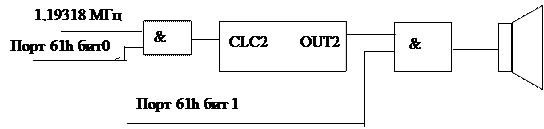 Звук формируется из тонального сигнала от второго канала таймера, работой которого можно программно управлять. Частоту сигнала (тон) можно изменять, программируя коэффициент деления счетчика, а разрешая/запрещая формирование сигнала программно-управляемым битом 0 системного порта 061h, можно подавать сигнал определенной длительности. Такой способ формирования звука мало загружает процессор и позволяет исполнять незамысловатые мелодии, причем в фоновом режиме.