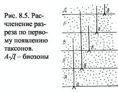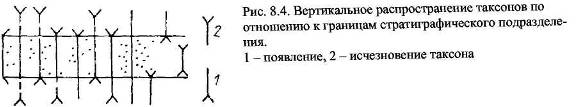 Предпочтение при проведении биостратиграфических границ обычно отдаётся не исчезновению в разрезах тех или иных форм, связанному с их вымиранием, а появлению или массовому распространению отдельных таксонов, сообществ или их комплексов (рис.8.5). Последнее особенно важно, так как часто только при массовом распространении и широком расселении соответствующие формы или комплексы приобретают определенное корреляционное значение.