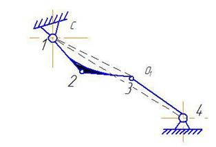 Груз поднимается вокруг точки O1. Трёхплечий рычаг поворачивается и шток упирается в упор. Шарнир заблокирован и всё устройство поднимается вокруг точки O2.