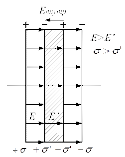 Поле зарядов сориентировано навстречу внешнему полю, поэтому внутри диэлектрика поле слабее, чем внешнее поле.