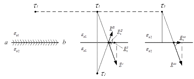 а) Если реальный провод и исследуемая точка находятся в одной среде, то поле рассчитывают от двух зарядов: действительного