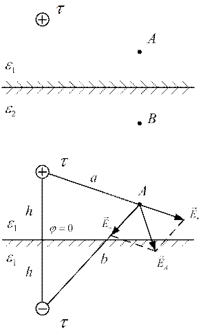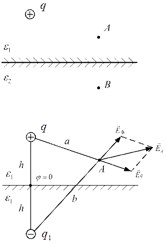 Точечный заряд лежит вблизи границы диэлектрик – диэлектрик. Требуется определить напряженность электростатического поля и потенциал в точке А и В. Пусть
