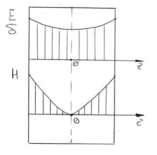 . Напряженность магнитного поля H и электрического поля E изменяется по синусоидальному закону.