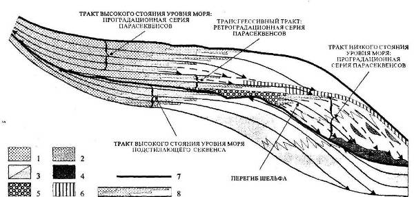 1 – песчаники и аргиллиты береговой равнины, 2 – мелководные морские песчаники, 3 - шельфовые и склоновые аргиллиты и песчаники, 4 – песчаники подводного конуса выноса, 5 – флювиальные песчаники врезанных равнин, 6 – конденсированные отложения, 7 – граница секвенса первого типа, 8 – парасеквенс.