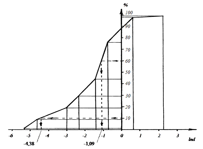 10 % и 60 %, опускаем на график перпендикуляры, а затем из полученных точек пересечения опускаем вторые перпендикуляры на ось абсцисс, получая значения натуральных логарифмов lnd10 = -4,38 и lnd60 = -1,09 соответственно (рис. 1). Возводя экспоненту в степень по полученным значениям, определяют d60 и d10.