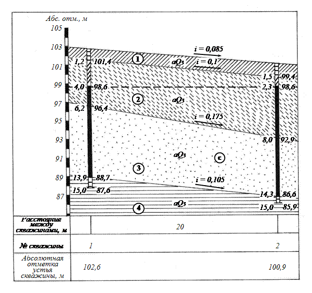 После этого справа от линии скважины обозначают абсолютные отметки уровней подземных вод и проводят уровень подземных вод пунктирной линией. Построение разреза заканчивают обозначением уклонов слоев грунта.