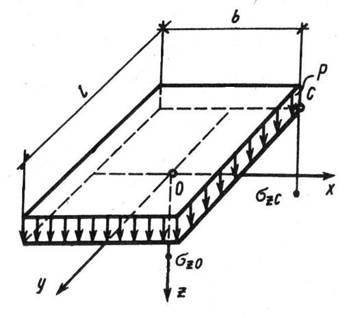 Действие равномерно распределенной нагрузки [38] в условиях пространственной задачи возникает тогда, когда к поверхности линейно деформируемого полупространства приложена местная нагрузка, распределенная по площади квадрата, прямоугольника, круга, эллипса и др. Значения вертикальных сжимающих напряжений σz в любой точке полупространства от действия нагрузки интенсивностью р, равномерно распределенной по площади прямоугольника размером l x b, были впервые получены А. Лявом. Практический интерес представляют значения сжимающих напряжений , проведенных из центра σzО и из углов σzС загруженной площади (рис. 3).