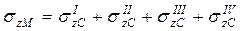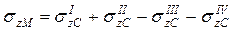 На рис. 4 в точка М расположена вне пределов площади загружения. Для данного случая точку М можно представить как угловую точку фиктивных площадей загружения I и II, при этом в пределах площадей III и IV фиктивная нагрузка прикладывается в обратном направлении. Напряжение σzМ определяется по выражению