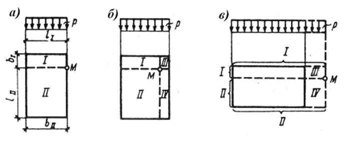 По методу угловых точек загруженную площадь делим на два прямоугольника таким образом, чтобы точка М попадала в угол каждого из них (рис. 5 а).