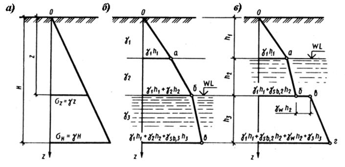 При неоднородном напластовании или наличии подземных вод, а также при горизонтальной поверхности напряжения от собственного веса грунтов будут определяться отдельно для каждого слоя (рис. 6 б). Причем удельный вес грунта, расположенного ниже уровня подземных вод, будет определяться с учетом взвешивающего действия воды γsb: