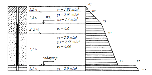 Далее по полученным значениям σ1–σ7 в масштабе строим эпюру распределения напряжений от собственного веса грунтов, которую совмещаем с уже построенной геологической колонкой (рис. 7).