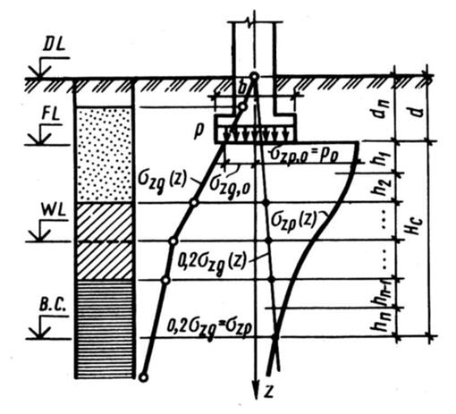 Сжимаемую толщу основания разбивают на n слоев при условии, что грунт в пределах слоя должен быть однородным. Толщину слоя hi принимают не более 0,4·b, а для фундаментов (штампов) с b > 4 м – не более 0,2·b.