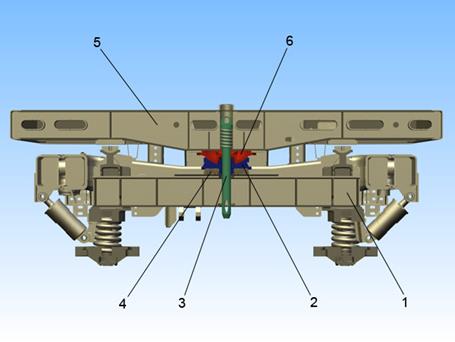 1 - центральная балка тележки; 2 – подпятник; 3 – шкворень; 4 – амортизатор; 5 - балка рамы шкворневая; 6 - пятник.
