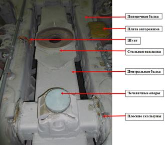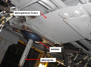 кольцевые и радиальные канавки для равномерного распределения смазки поступающей через отверстия в пятнике). Резинометаллический амортизатор (резиновая шайба, армированная с обеих сторон стальными листами. Толщина амортизатора 36 – 2 мм, но не менее 30 мм.). Предохранительный шкворень (стальной стержень диаметром 55 мм, и длиной 550 мм. В верхней части шкворень имеет головку, которой он опирается на пружину, на головке шкворня приварено ушко для постановки и извлечения шкворня. В нижней части чека для фиксации шкворня.