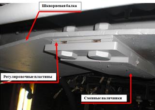 Боковые роликовые или чечевичные опоры (скользуны)обеспечивают устойчивость кузова, ограничивая его продольные перемещения при прохождении вагоном кривых участков пути, чем обеспечивается равномерное распределение нагрузки на к/п. Суммарный зазор между скользунами кузова и тележки в эксплуатации 3 – 8 мм. Регулировка зазора производиться путем изменения числа 2 мм, стальных пластин под сменными наличниками на шкворневой балке (рис.22).