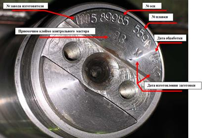 Обработанная ось клеймится(рис. 35): клейма располагаются на торце первой шейки оси и необходимы для периодической проверки и контроля за работой оси колесной пары в процессе эксплуатации.