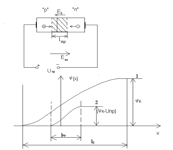 В этом случае под действием внешнего электрического поля основные носители заряда начнут перемещаться в сторону p-n перехода. На рис.4 представлены схема включения p-n перехода в прямом направлении и диаграмма распределения потенциала вдоль p-n перехода.
