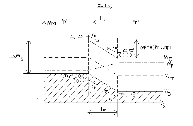 На рис.4 обозначено: Uпр - напряжение внешнего источника, приложенного к p-n переходу в прямом направлении (прямое смещение p-n перехода); Eвн - напряженность внешнего электрического поля;