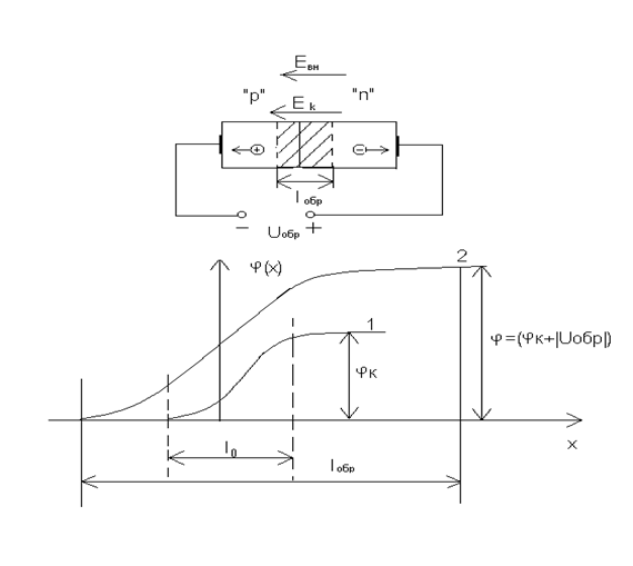 На рис.6 обозначено: lо - ширина p-n перехода в равновесном состоянии, определяемая по зависимости 1 - распределение потенциалов в равновесном состоянии p-n перехода; lобр - ширина p-n перехода при обратном смещении, определяемая по зависимости 2 - потенциальная диаграмма при обратном смещении p-n перехода ; jк - высота потенциального барьера в равновесном состоянии p-n перехода; (jк+çUобрç) - высота потенциального барьера при обратном смещении p-n перехода.