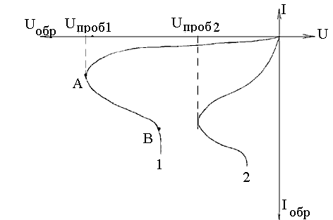 В точке А обратное напряжение на p-n переходе достигает значения напряжения теплового пробоя UПР1, при котором начинается быстрый рост IОБР. ВАХ p-n перехода с тепловым пробоем имеет участок АВ, на котором дифференциальное сопротивление отрицательно: