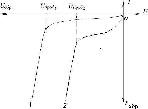 С увеличением температуры напряжение пробоя уменьшается и становится равным UПРОБ2 (зависимость 2 рис.14). Это обусловлено тем, что при увеличении температуры возрастает амплитуда тепловых колебаний атомов полупроводника в узлах кристаллической решетки, энергия электронов также растет, величина контактной разности потенциалов p-n перехода jК снижается, ширина p-n перехода lОБР уменьшается, а напряженность электрического поля в