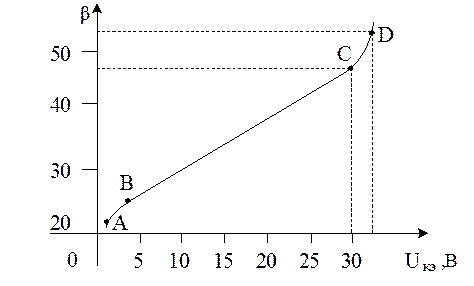 будет больше изменение толщины базы и зависимость рис. 8 этот факт учитывает участком АВ. При б`ольших напряжениях на коллекторе зависимость β на рис.1 имеет линейный характер ( участок ВС ). Например, для транзистора p-n-p типа имеем при Uкб1= -2 В α1=0,96, а при Uкб2= -30 В α1=0,98. Тогда, β1