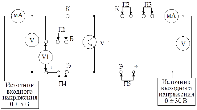 Прибор (мА) источник входного напряжения измеряет ток базы (