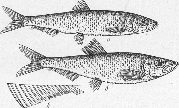 Рис. 3. Тюльки: а — анчоусовидная; б — большеглазая; в — анальный плавник тюльки.