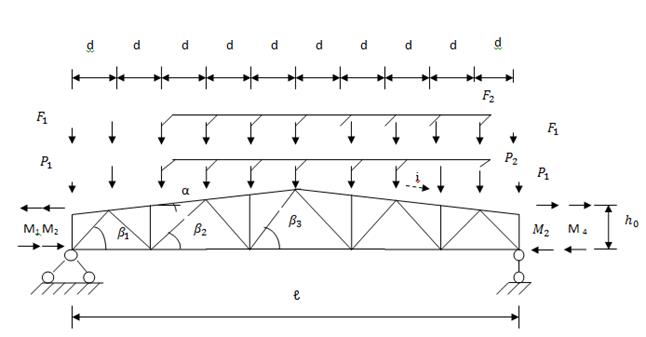 Рисунок 9. Геометрическая схема фермы – 10d. Схема вертикальных нагрузок и опорных моментов действующих на узлы фермы