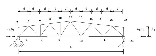 Рисунок 10. Схема нумерации узлов фермы – 10d. Номера 3; 7; 11; 15; 21 условно не показаны. Схема нагрузок рамного распора