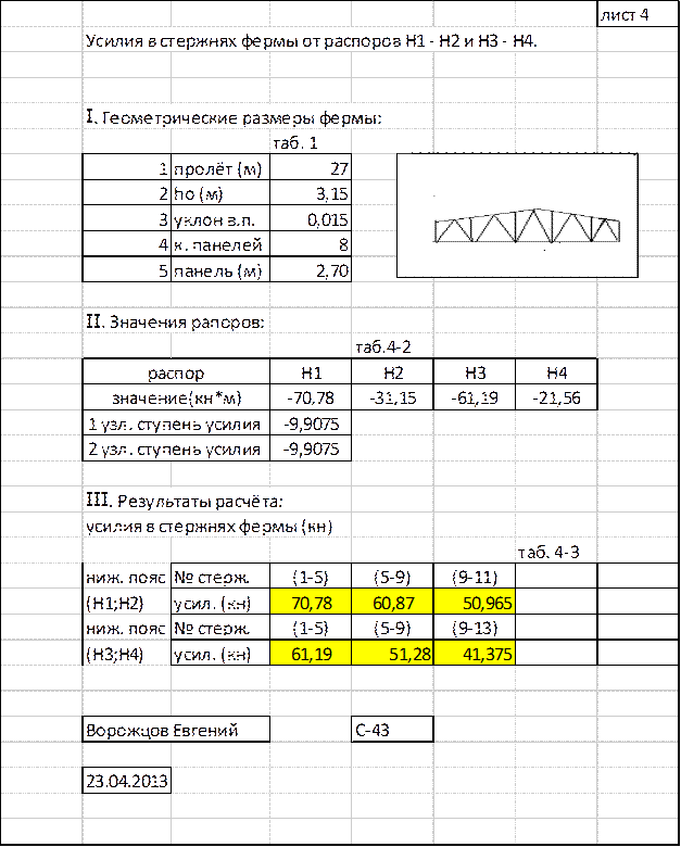 Усилия в стержнях фермы от распоров Н1 - Н2 и Н3 - Н4