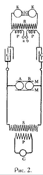 Каждый раз, когда дуга между точками А и В прерывается, банки быстро заряжаются и разряжаются через первичную обмотку р р, производя проскакивающую с треском между шарами К К искру. Когда между точками А и В устанавливается дуга, потенциала падает, и банки не могут зарядиться до такого потенциала, чтобы пробить воздушный зазор а b, до тех пор, пока воздушный поток вновь не разорвет дугу.