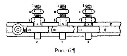 На Рис. 6 и 7 показана другая форма разрядника, используемого в этих и схожих с ними экспериментах. Он состоит из множества латунных элементов С С (Рис. 6), каждый из которых имеет сферическую среднюю часть m, продолговатую нижнюю часть е, — она служит только для крепления детали в токарном станке во время полировки разрядной поверхности, — и верхнюю часть. Верхняя часть состоит из выпуклого фланца f, заканчивающегося стрежнем l с резьбой. На него навинчивается гайка n, при помощи которой к верхней части разрядника крепится провод. Фланец f служит, чтобы держать латунную деталь когда крепится провод, а также для поворачивания в любую сторону, когда нужно подставить свежую разрядную поверхность. Две толстые резиновые полоски R R (Рис. 7) с желобками g g, вырезанными под средние части С С деталей, служат для более плотного закрепления деталей в своем положении при помощи двух болтов С С (на рисунке представлен только один из них), проходящих через концы резиновых полосок.