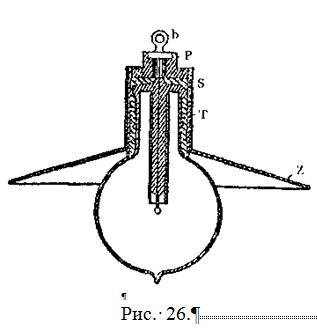 На Рис. 26 представлена более совершенная компоновка элементов, использованная в конструкциях некоторых из этих ламп. Такая конструкция ламп показана и описана ранее, когда делались ссылки на Рис. 19. Цинковый лист Z с трубкой Т надет на металлическое гнездо S. Лампа подвешена на клемме t. Цинковый лист Z выполняет двойную функцию: усилителя и отражателя. Отражатель отделен от клеммы t насадкой изолирующей пробки Р.