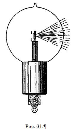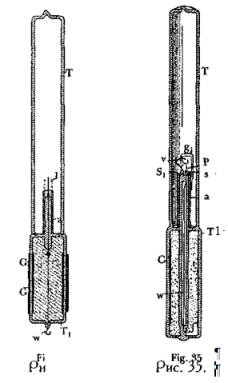 На Рис. 33 представлена другая конструкция лампы. В этом случае трубка Т припаяна к шару L. Трубка содержит катушку С, концы которой проходят через две маленьких стеклянные трубки t и tj, которые припаяны к трубке Т. Два тугоплавких электрода m и m 1 размещены на нитях накаливания лампы, которые подсоединены к концам проводов, проходящих через стеклянные трубки t и t j.
