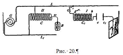 На Рис. 20 I представлен план, которому следовали при изучении резонансных эффектов с использованием высокочастотного генератора переменного тока, где С1 — катушка, состоящая из большого количества витков, которая для удобства настройки разделена на множество небольших секций. Окончательная настройка иногда проводилась при помощи нескольких тонких железных проводов (хотя это и не рекомендуется), либо при помощи вторичной обмотки. Катушка С1 одним своим выходом соединена с контуром " L", идущим от генератора G, а другим выходом с одной из пластин С конденсатора С С1. Пластина С1 конденсатора подключена к значительно большей по размерам пластине Рj. Таким образом, параметры емкости и самоиндукции оказались настроены на частоту динамо-машины.