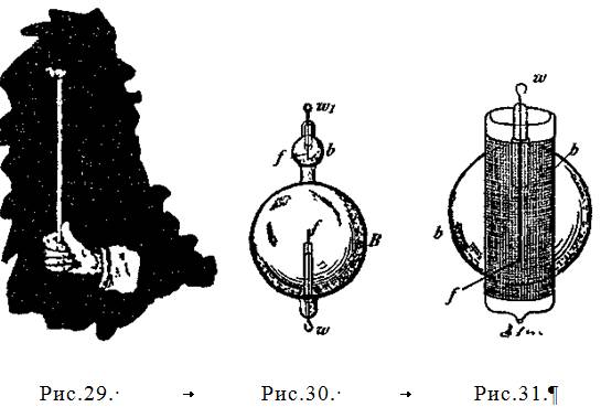 Затем, я взял лампу с сильно разреженным газом, внутри которой находилось сильно фосфоресцирующее тело. На д этим телом располагается маленькая алюминиевая пластина на платиновой проволоке, выходящей наружу. Когда ток проходил через мое тело, то вызывал сильное свечение в лампе (Рис. 27). Когда я вновь взял в руку простую трубку с разреженным воздухом внутри, то точно также, газ внутри трубки стал излучать свет (Рис. 28). Наконец, я могу взять в руку провод, оголенный, или покрытый толстым слоем изоляции — в данном случае это несущественно. Пр и этом интенсивность электрических колебаний настолько высока, что на поверхности провода возникает светящаяся пленка (Рис. 29).