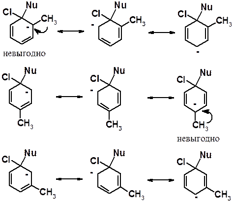 При расположении донорной группы в орто- или пара-положениях, можно отметить две невыгодные граничные структуры, наличие которых позволяет сделать вывод о дестабилизационном влиянии донорной группы на анионный s-комплекс и уменьшении подвижности галогена. Наличие донора в мета-положении к галогену, выраженного дестабилизирующего действия они не оказывают. Некоторая дезактивация атома галогена вызывается только общим + I-эффектом.