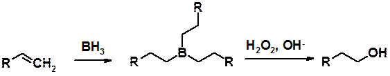 Гидратация алкенов не позволяет получать первичные спирты. Прекрасным методом получения спиртов против «правила Марковникова» является реакция гидроборирования-окисления. На первой стадии синтеза алкен, реагируя с гидридом бора (кислотой Льюиса), образует алкилборан, окисление которого перекисью водорода в щелочной среде приводит к спирту.