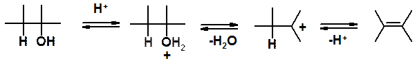 Реакция проходит под действием серной кислоты при нагревании. В спиртах, в отличие от галогеноалканов, элиминирование протекает по мономолекулрному механизму (Е1).