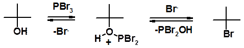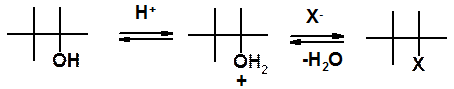 Особенности реакций нуклеофильного замещения подробно рассмотрены в разделе «Галогенопроизводные». Замещение гидрокси-группы на галоген – реакция обратная рассмотренной выше, проходящая по тем же основным закономерностям SN реакций. Замещение ОН-группы на галоген может быть выполнено несколькими путями. Самый простой, но не самый лучший (т.к. возможны перегруппировки и другие побочные реакции) – действием галогеноводородной кислоты на соответствующий спирт. Особенность превращения в том, что сначала происходит активация субстрата, посредством протонирования. В дальнейшем происходит замещение воды, а не ОН-группы.