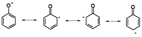 Для объяснения изменений кислотности фенолов надо рассмотривать стабильность образующегося аниона. Логика анализа феноксид-аниона по устойчивости граничных структур аналогична рассмотрению стабильности s-комплекса, в реакциях нуклеофильного замещения галогена в ароматическом ряду (см. лекцию 25).