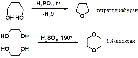 Получение оксиранов см. раздел «Алкены». Пяти- и шестичленные циклы с эфирным кислородом получают внутримолекулярной дегидратацией 1,4- или 1,5-диолов, соответственно.